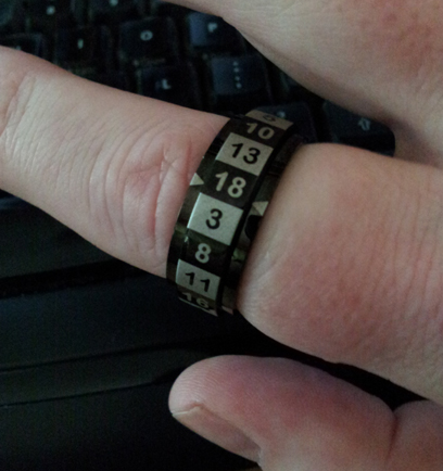 Regular readers of the site will know I am a bit of a fan of dice, in the same way Lady Bathory was a bit of a fan of virgins. So my initial impression of the d20 ring was, “Cute, but I like my dice.” I also had my doubts of its true randomness, so it was looking like it would stay firmly in my “neat curiosity” category. But I’d never use it in a game.