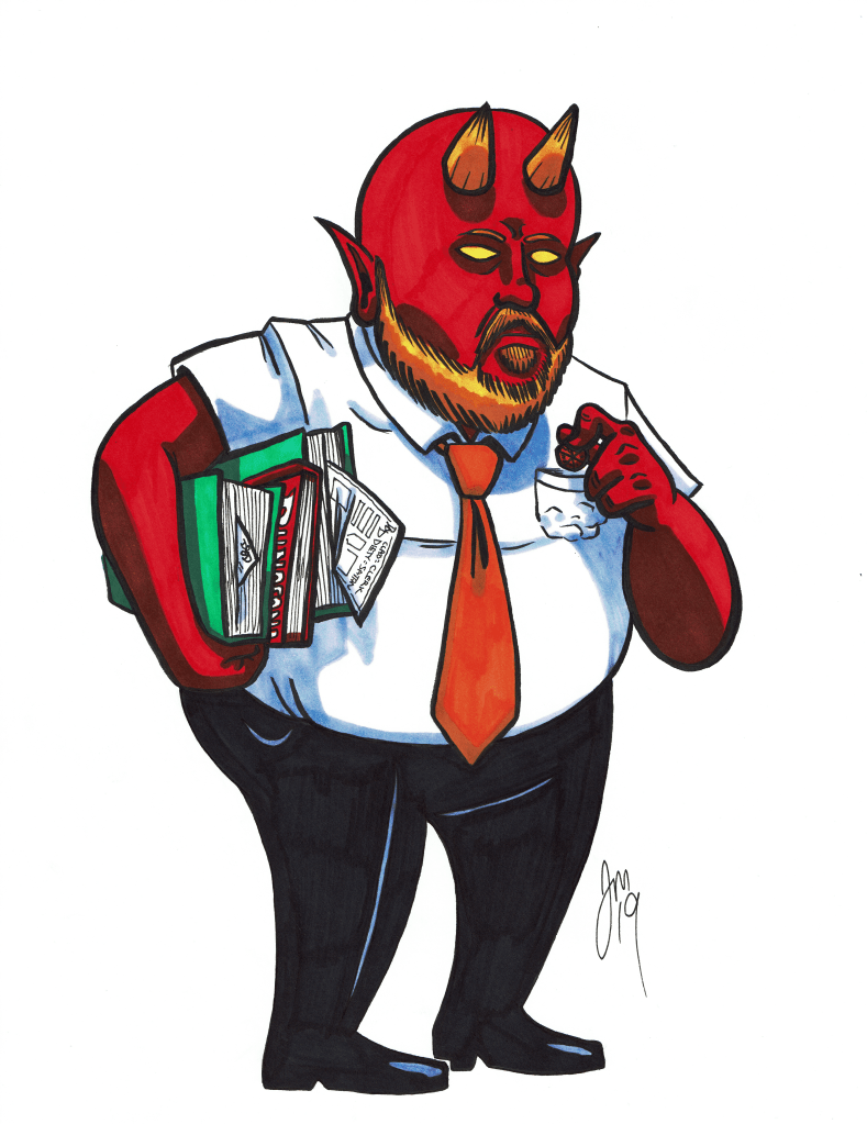 I’m working on some posts, but wanted to share this wonderful piece from my buddy Jeff Martin (@HEATComic). As part of backing his Hell, Inc Kickstarter I got a Hell, Inc Staff Portrait. Welcome, Devil Brent! Devil Brent (DB for short) runs the office TTRPG, and loves to switch editions on his players, sometimes mid-session.
